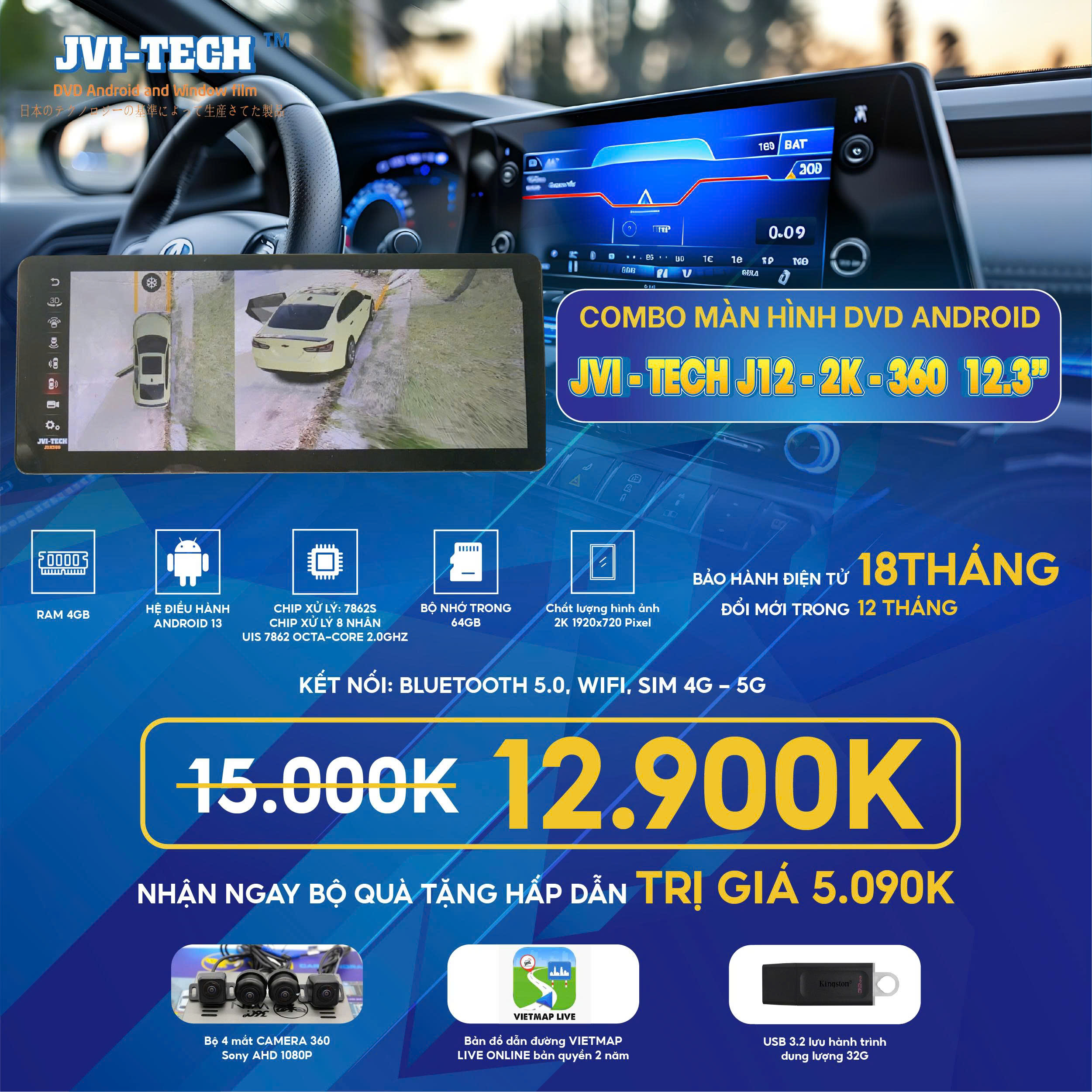 Ngoài việc giữ lại hầu như các chức năng của dòng sản phẩm J12_2K 12.3″ thì máy được trang bị thêm 4 mắt camera chip Sony AHD 225 bao gồm trước, sau và hai bên giúp xóa bỏ hoàn toàn mọi góc chết xung quanh xe .